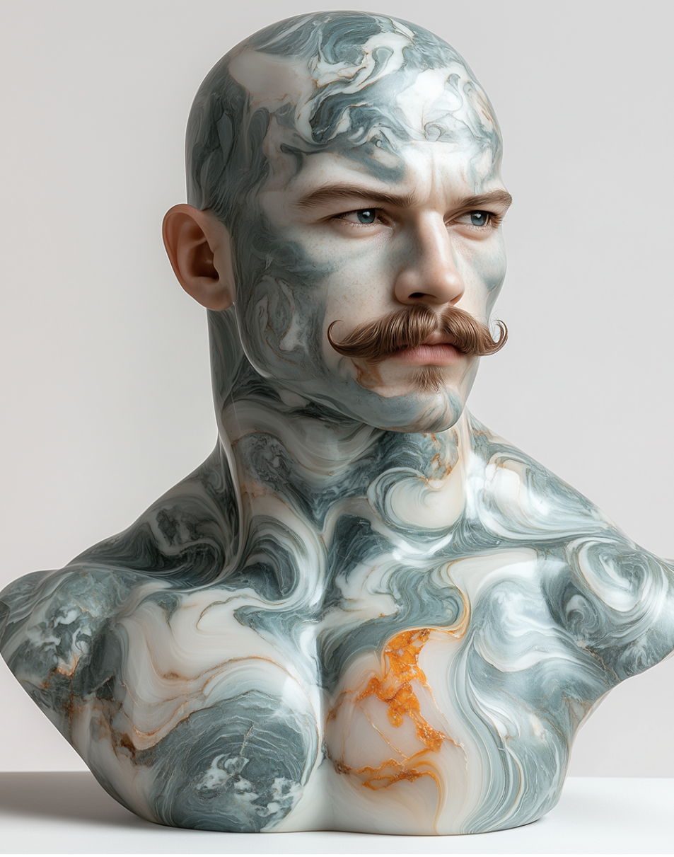 The Robertson Collection reimagines a lost archive of male sculptural portraiture — figures that appear to emerge from the ruins of classical antiquity, yet feel distinctly modern. Attributed to the vanished art historian Dr. Kyros Robertson, these digital works blur the line between archaeology and invention, myth and memory. Their forms evoke marble, ceramic, or surreal composites; their presence is haunting, expressive, and timeless.